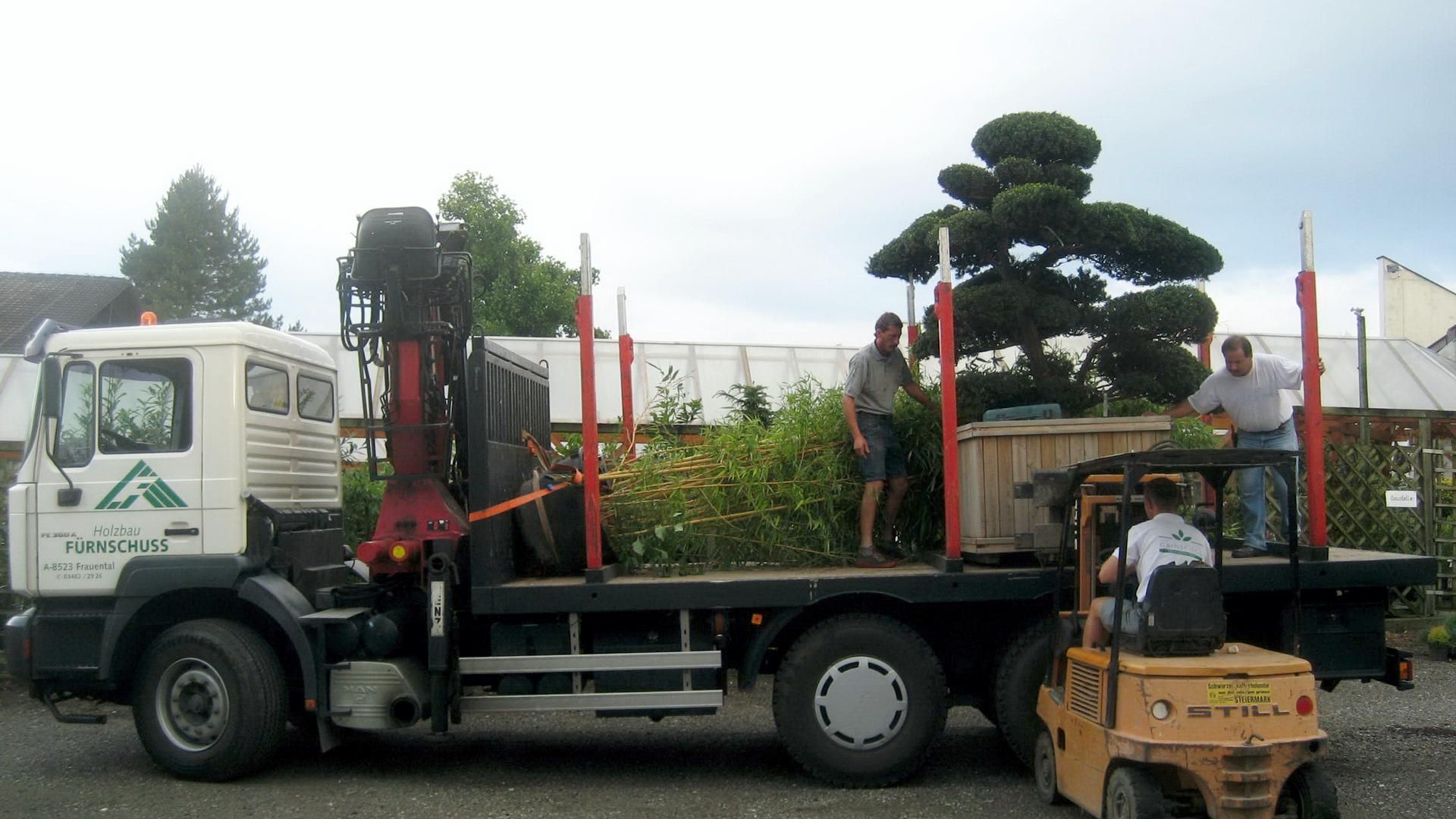 Baum zu groß für den Kofferraum? Kein Problem! Gerne stellen wir Ihnen Ihre ausgesuchten Pflanzen, Bäume,... zu. Durch die Möglichkeit der Kranverlastung können wir Ihren Baum punktgenau absetzen.